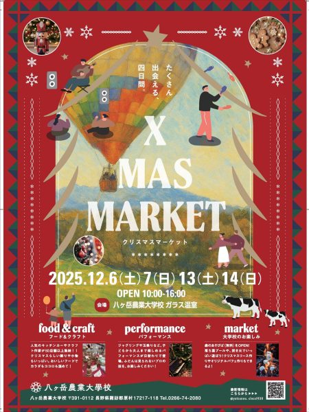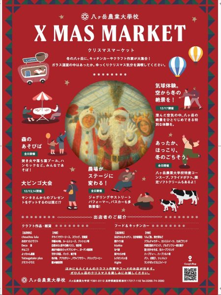 12月6日、7日、13日、14日の4日間、長野県原村にある八ヶ岳農業大学校にて「Xmas Market」が開催されます。昨年からはじまったこのイベントは、日々の感謝を込めて1年の締めくくりとして行われるもの。八ヶ岳エリアを中心に人気の飲食店やクラフト作家さんが50店舗以上も大集合します!