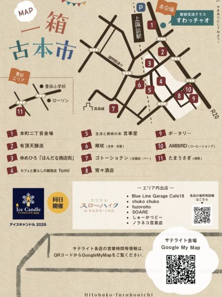 2月7日、上諏訪駅前交流テラス・すわっチャオをメイン会場にした「かみすわ一箱古本市」が開催されます!