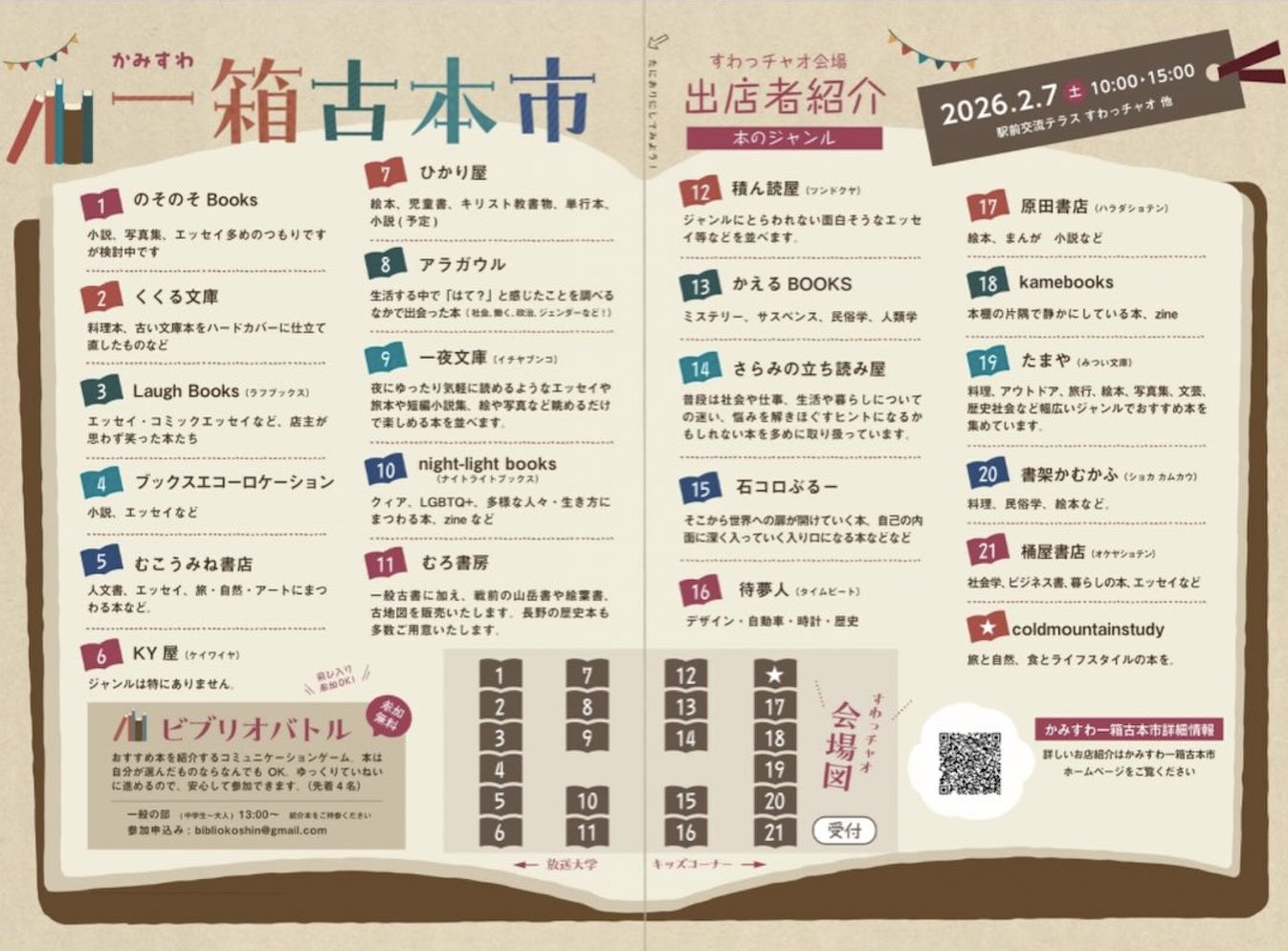 2月7日、上諏訪駅前交流テラス・すわっチャオをメイン会場にした「かみすわ一箱古本市」が開催されます!