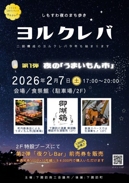 長野県下諏訪町にて、夜のまち歩きを楽しむ「ヨルクレバ」が開催されます! 諏訪大社下社秋宮前の食祭館をはじめ、町内でお店を構える12のお店が参加し、たくさんのおいしいものが集まりますよ。