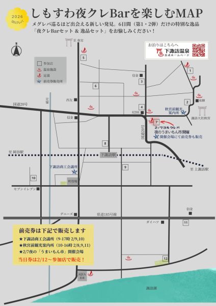 下諏訪の町で、歩いて、食べて、飲んで、話して……。夏とも、昼ともまたひと味違う、冬の夜の下諏訪を楽しむことができます。ぜひこの機会に、いろんなお店に立ち寄ってみてください。