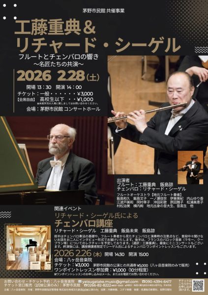 2月28日、茅野市民館にて「フルートとチェンバロの響き〜名匠たちの共演〜」が開催されます。
