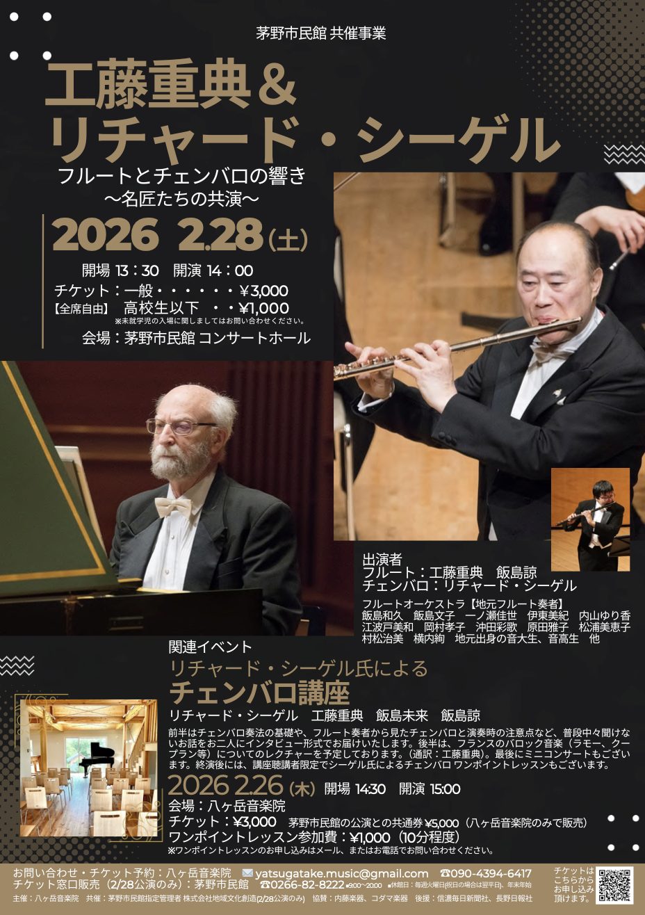さらに、コンサートの2日前である2月26日は、富士見町にある音楽ホール・八ヶ岳音楽院にて「リチャード・シーゲル氏によるチェンバロ講座」が行われます。