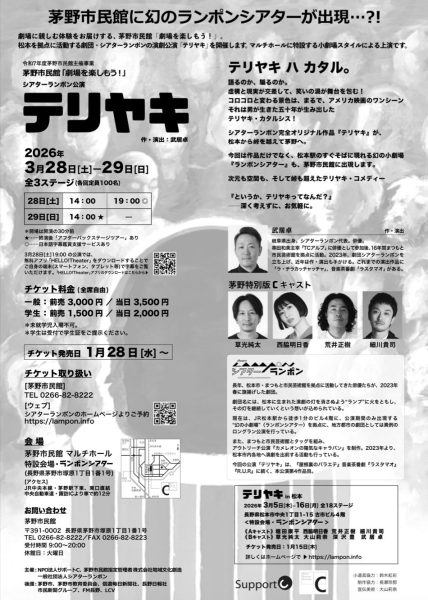 3月28日、29日の2日間にわたり、茅野市民館マルチホールにて「劇場を楽しもう!」シアターランポン公演「テリヤキ」が開催されます。